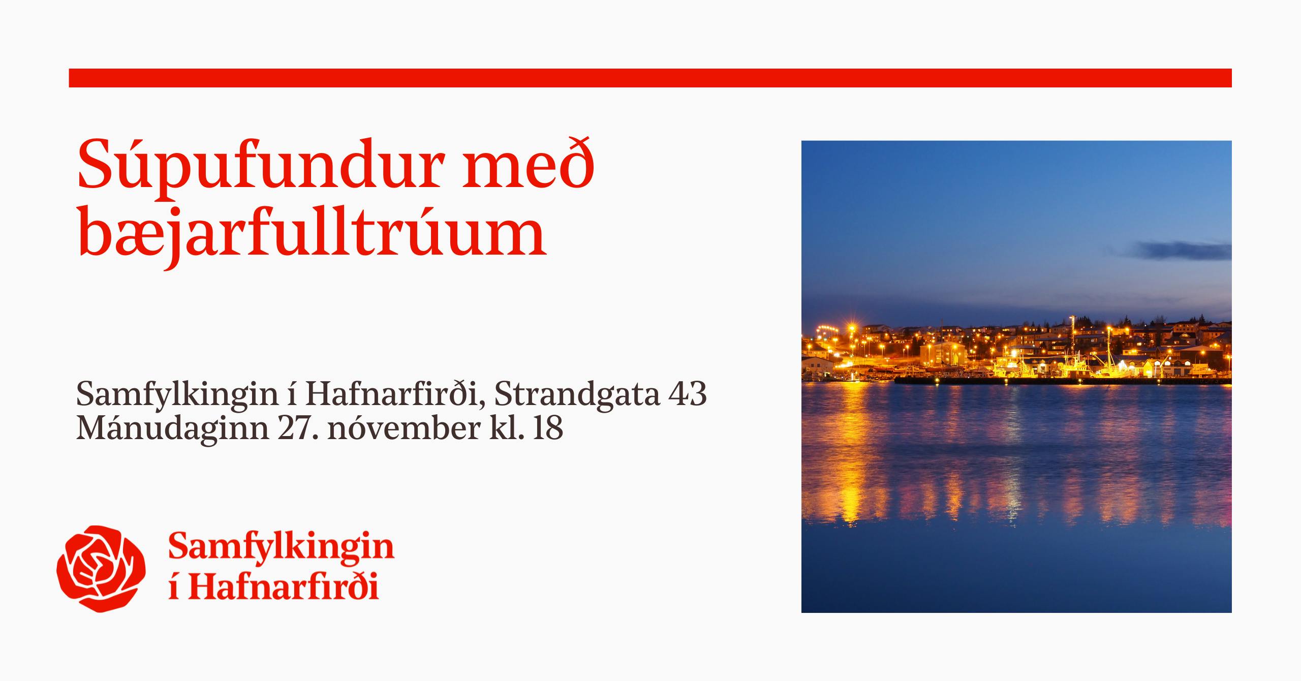 Bæjarfulltrúar flokksins í Hafnarfirði Guðmundur Árni Stefánsson, Sigrún Sverrisdóttir, Árni Rúnar Þorvaldsson og Stefán Már Gunnlaugsson (í forföllum Hildar Rósar Guðbjargardóttur) munu fara yfir áherslur Samfylkingarinnar í Hafnarfirði og fara yfir stöðu mála í bænum okkar nú þegar fjárhagsáætlun Hafnarfjarðarbæjar verður afgreidd í byrjun desember. Skipulagsmál, húsnæðismál, almannavarnir, heilsugæsla, hjúkrunarheimili, leikskólar og grunnskólar. Allt þetta og miklu meira á dagskrá.
