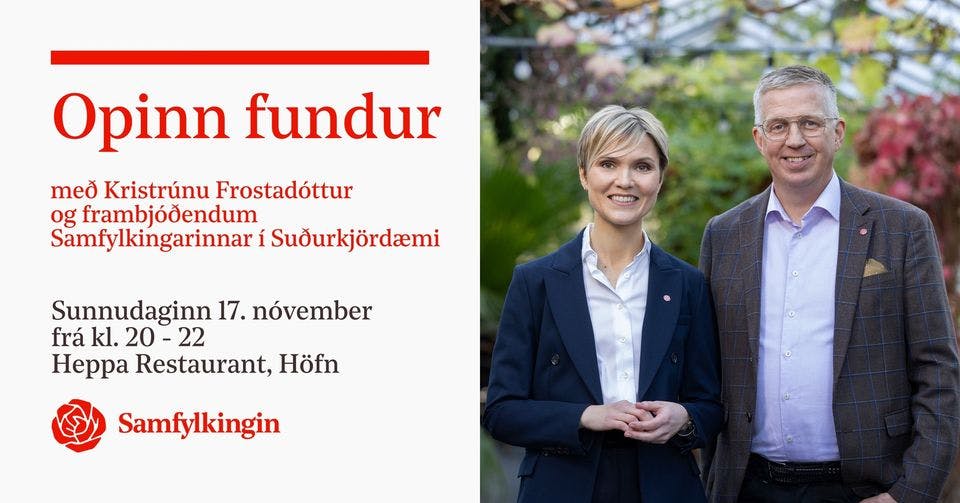 Samfylkingin í Suðurkjördæmi ásamt Kristrúnu Frostadóttur, formanni Samfylkingarinnar, bjóða íbúum á Höfn og nágrennis til opins fundar.